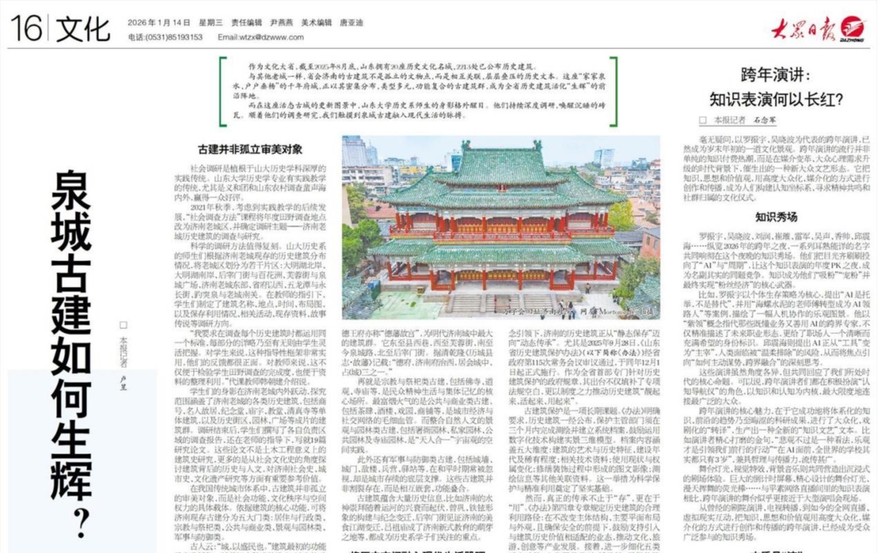 2025年12月14日,山东大学历史学院师生一行赴德州市乐陵市铁营镇大王庄开展了田野调查活动。此次调查聚焦改革开放前后鲁北农村的社会、经济与生态环境变迁,旨在结合口述访谈与账本、家谱、村镇志等民间文献,探究鲁北乡村社会半个世纪以来的发展演变轨迹,并锻炼同学们学以致用、开展田野调查的能力。调查团队由韩朝建副教授带队,历史系2024级本科生吝依卓、马思羽、王睿霆与档案系2024级本科生陈思澄参加。乐陵市政协委员、...