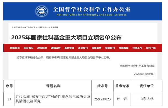 近日,全国哲学社会科学工作办公室公布了2025年国家社科基金重大项目立项名单。由我院孙一萍教授担任首席专家的课题“近代欧洲‘东方’‘西方’对峙性概念的形成历史及其话语机制研究”成功获批立项。